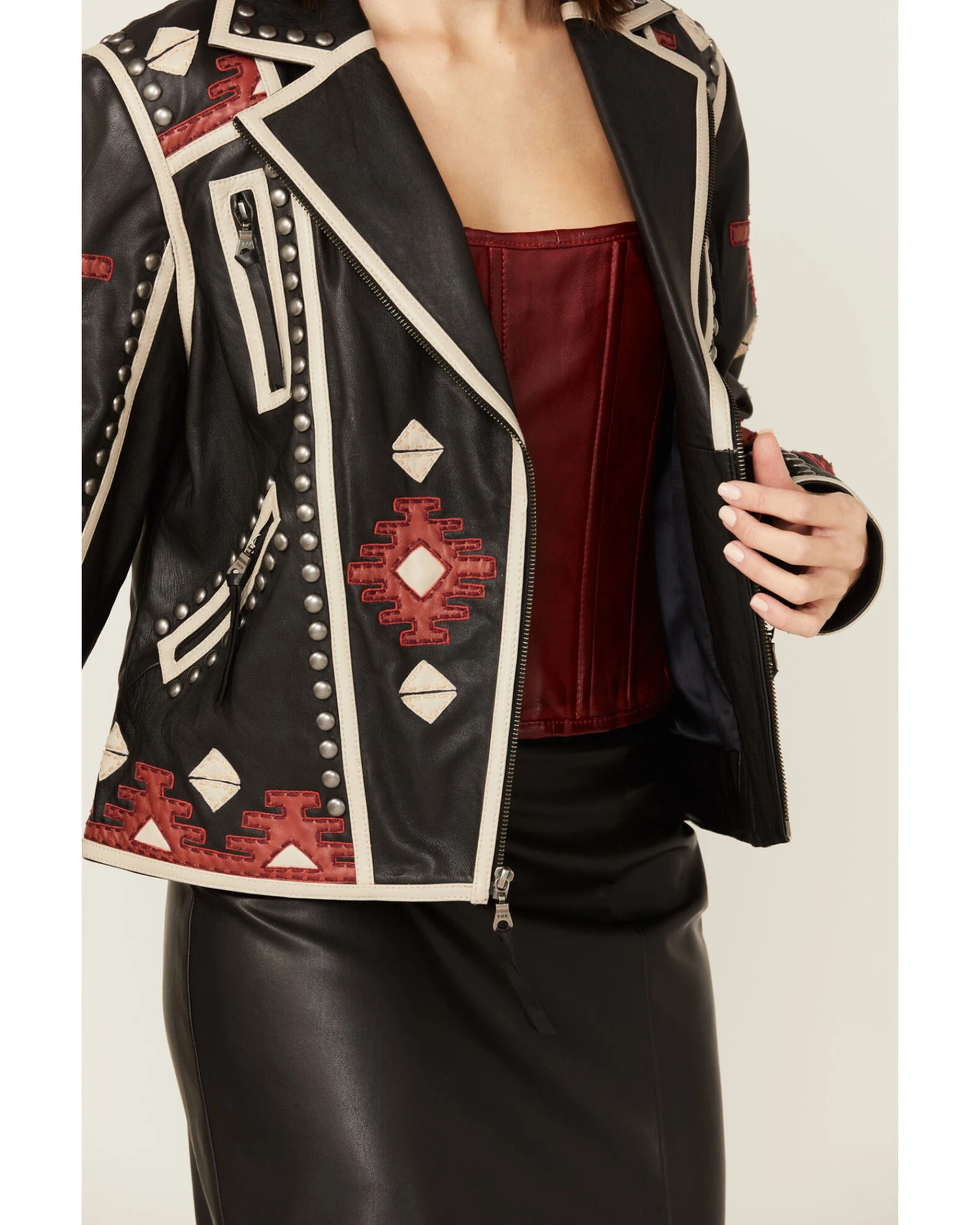 Double D Ranch Women’s Chilli Pantine Studded Southwestern Leather Jacket