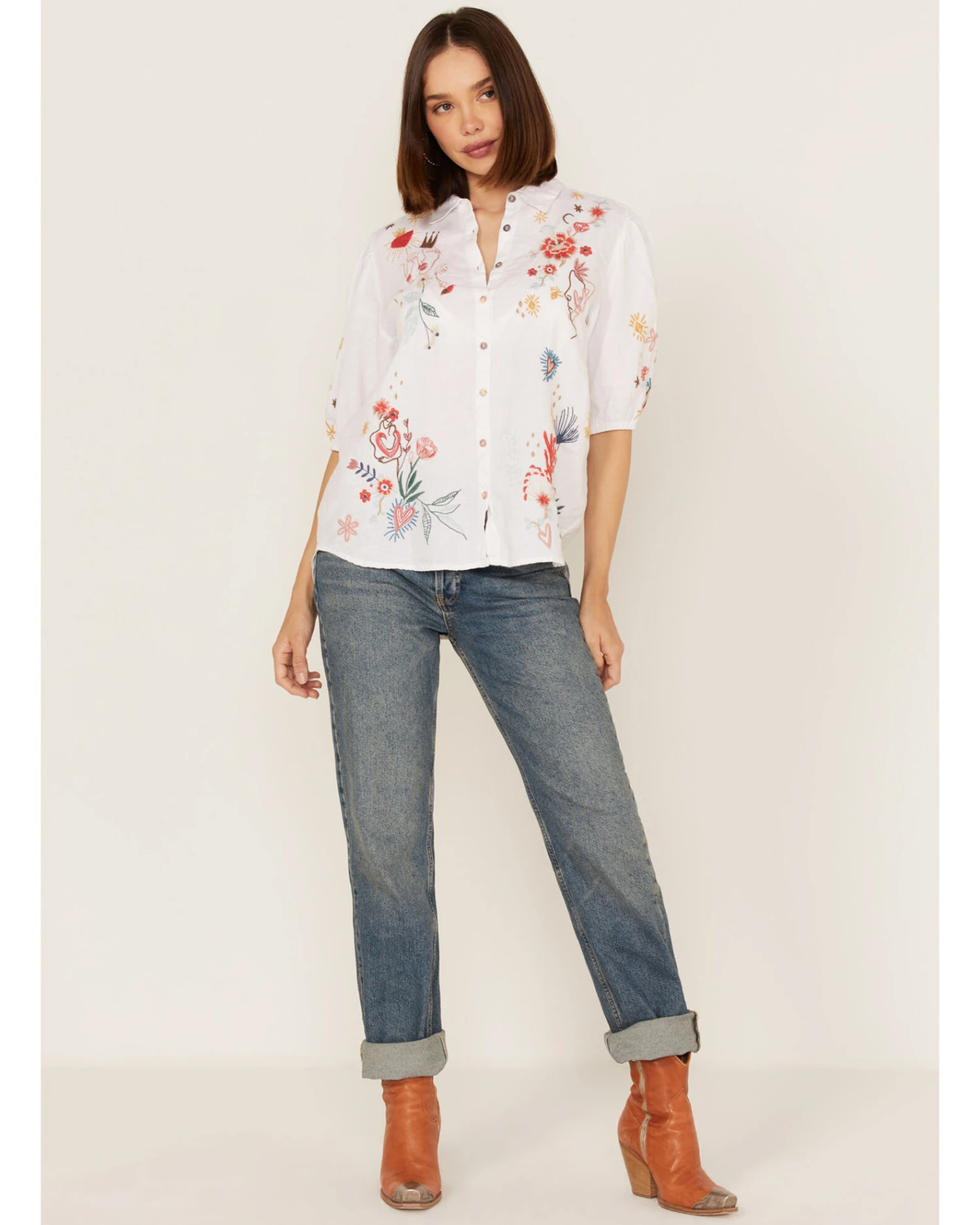 Johnny Was Women’s Embroidered Lisbon Short Sleeve Button Down Blouse