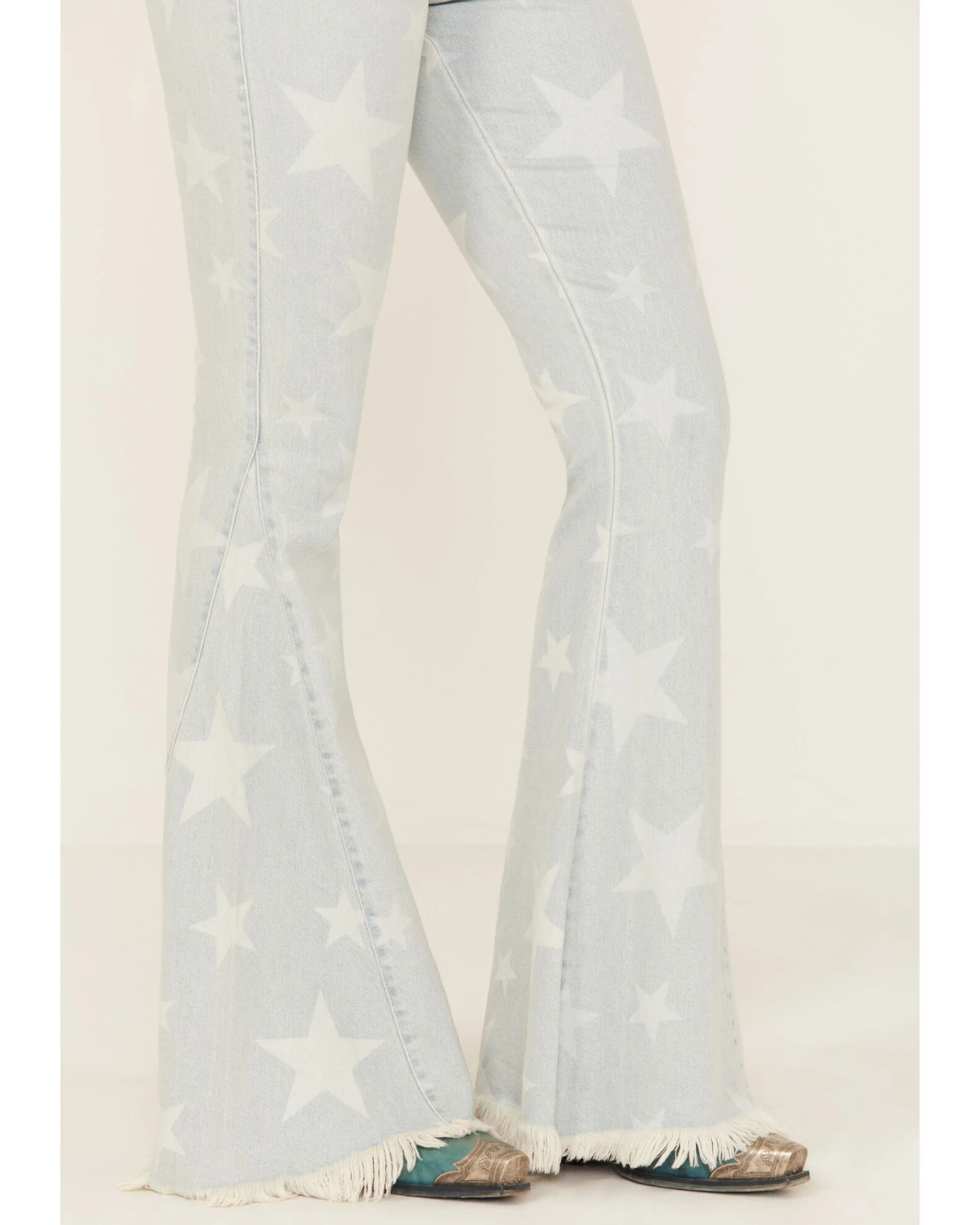 - Bell bottom flare leg with frayed hems