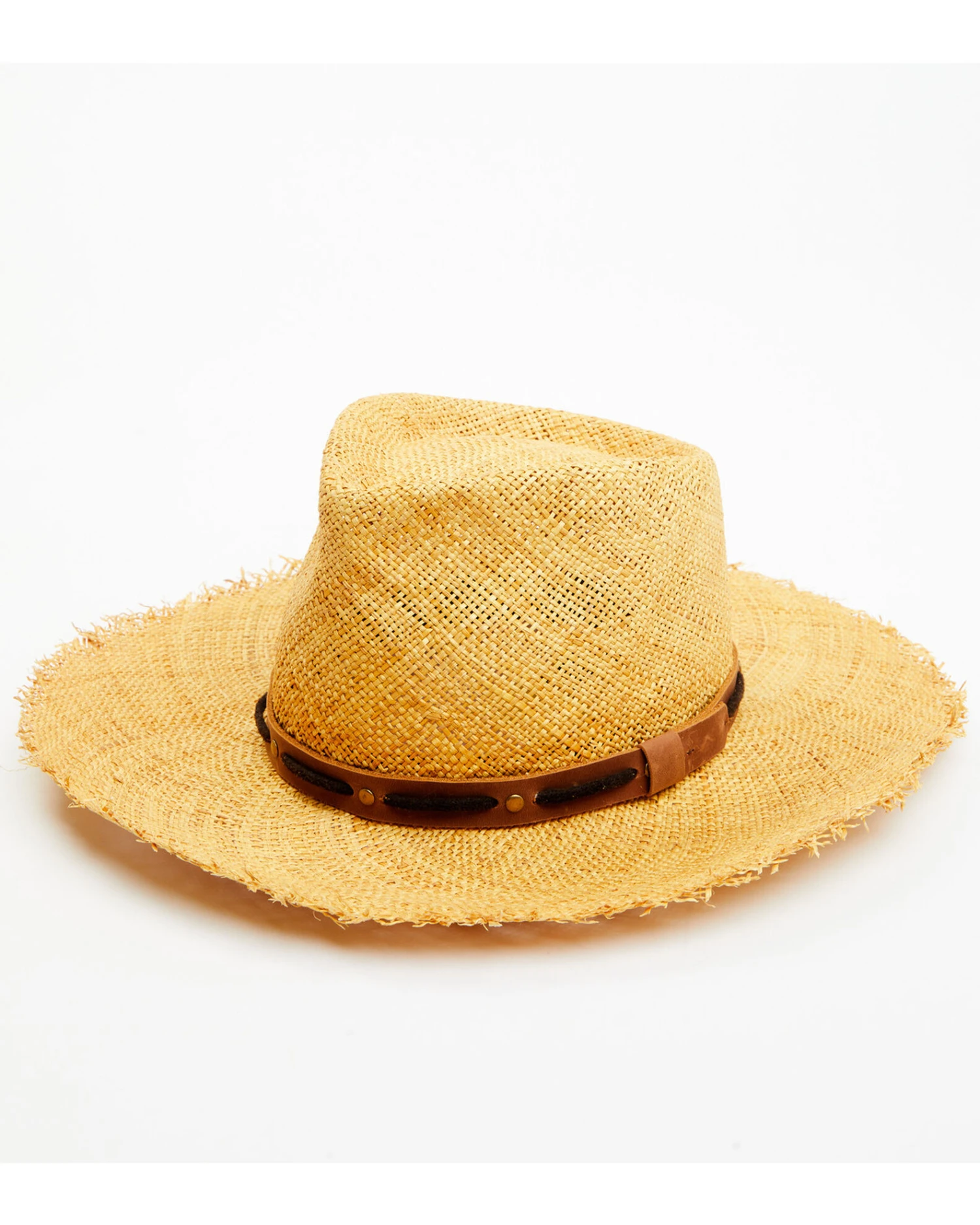 - Brown leather hat band with braided and studded detailing